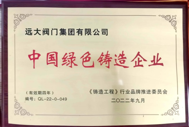 2022年9月20日,中國(guó)鑄造協(xié)會(huì)在上海組織召開了年會(huì),并舉行了“中國(guó)綠色鑄造企業(yè)”榮譽(yù)稱號(hào)授牌儀式,遠(yuǎn)大閥門集團(tuán)有限公司獲得了“中國(guó)綠色鑄造企業(yè)”榮譽(yù)稱號(hào)。